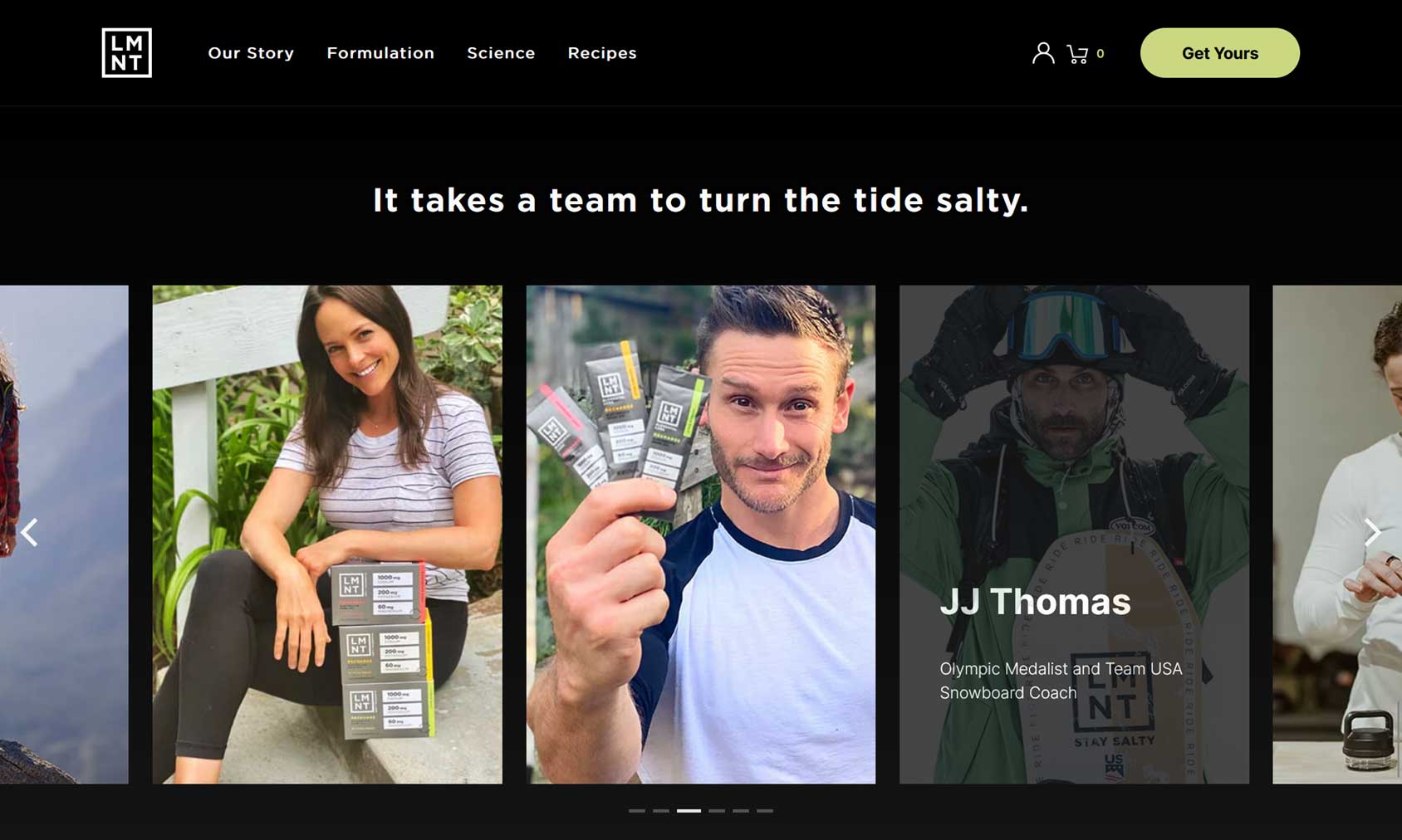 LMNT provides another well-designed example of displaying social proof on your homepage. This time, it’s a slider that highlights the people using their products, but for you, it could be reviews or testimonials.