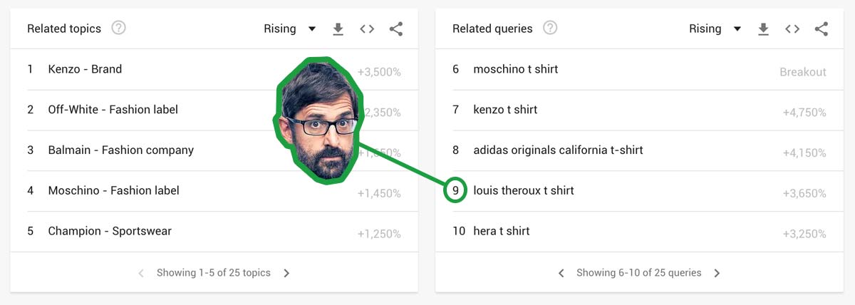 Interestingly Pro Wrestling tees make an appearance here also. Some new related searches appeared also – Fortnite, the incredibly popular multi-player computer game is a breakout topic and.. number 9 is.. wait a minute.. Louis Theroux?