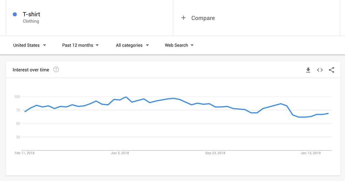 Let’s search on Google Trends for a very common product – t-shirts. Setting just the United States for now, and looking at how popular this term has been over the last 12 months reveals the following data.